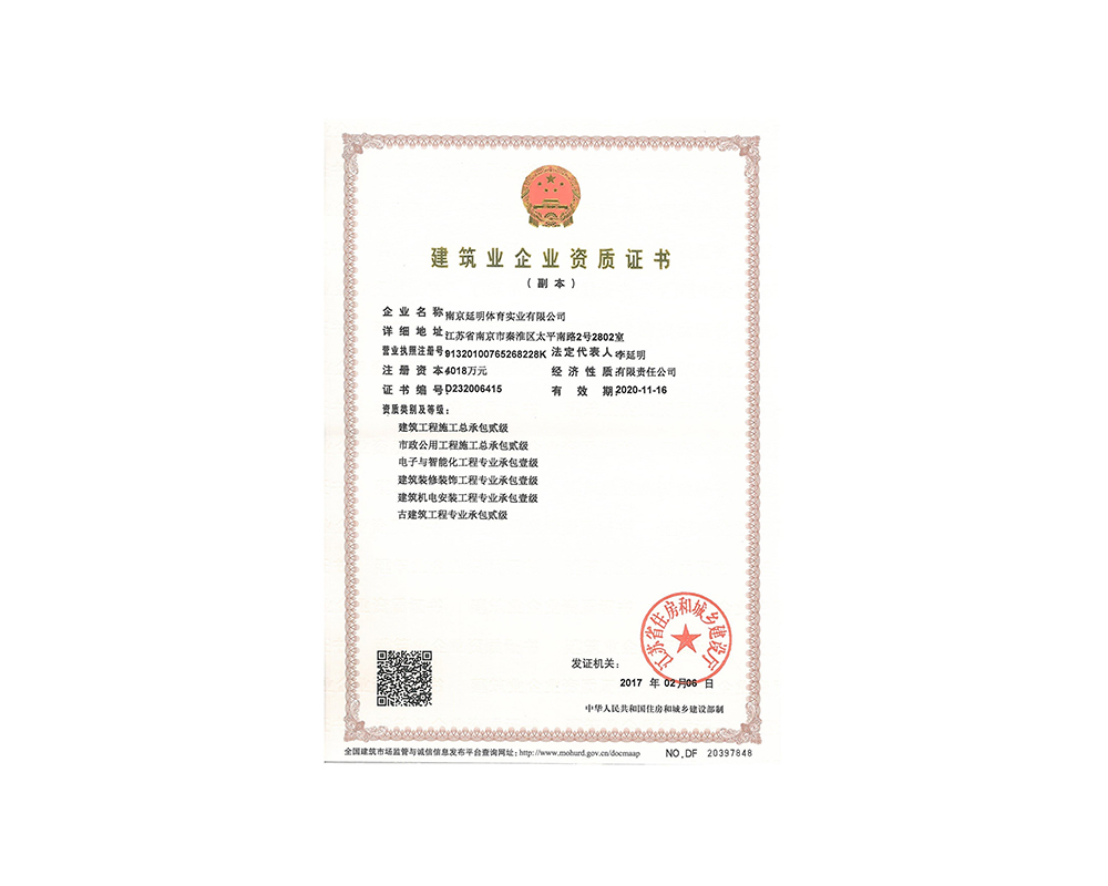 作为江苏省体育产业示范单位,KY开元·(中国)集团体育拥有多年相关工程总承包施工经验,取得建筑工程施工总承包二级、古建筑工程专业承包二级、建筑装修装饰工程专业承包一级、电子与智能化工程专业承包一级、市政公用工程施工总承包二级资质;通过ISO 9001:2015质量管理体系认证;通过ISO14001:2015环境管理体系认证;通过IOS45001:2018职业健康安全管理体系认证。